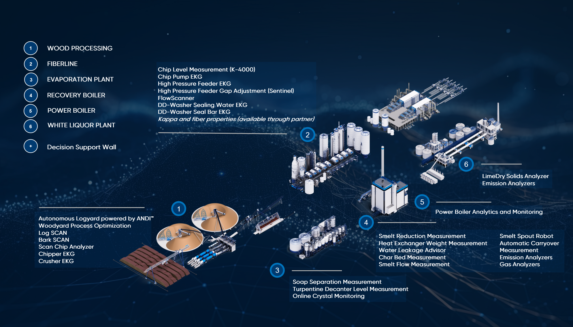 - Measurements: Intelligent process measurements and machine vision analysis enhance process understanding, filling gaps in information previously unavailable. They play a central role in laying the groundwork for optimizing processes in pulp and paper mills.